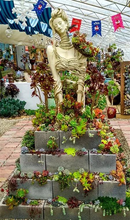 多肉垒砌的高台中间矗立着这样一个外国女神,